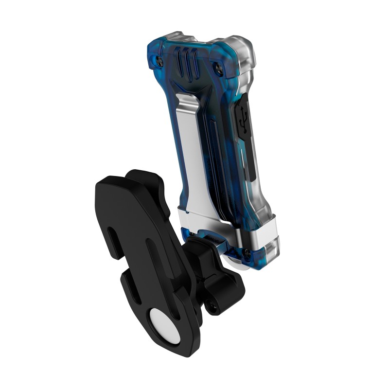 Wytrzymały stalowy pierścień pozwala nosić latarkę wraz z kluczami. Odpinany klips ze stali nierdzewnej bezpiecznie mocuje się do ubrania lub paska. Obrotowe mocowanie 360° z magnesem i plastikowym klipsem na czapce umożliwia użycie latarki jako czołowej. Silny magnes w uchwycie bezpiecznie utrzyma latarkę na metalowej powierzchni. Wbudowany akumulator Li-Pol łatwo się ładuje za pomocą kabla Micro-USB.