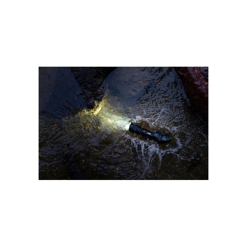 Pełna ochrona latarki przed wodą, brudem i kurzem zgodnie ze standardem IP68. Gdy zamontowany jest taktyczny włącznik żelowy, stopień ochrony odpowiada IP67. Wytrzymuje upadki z 10 metrów.