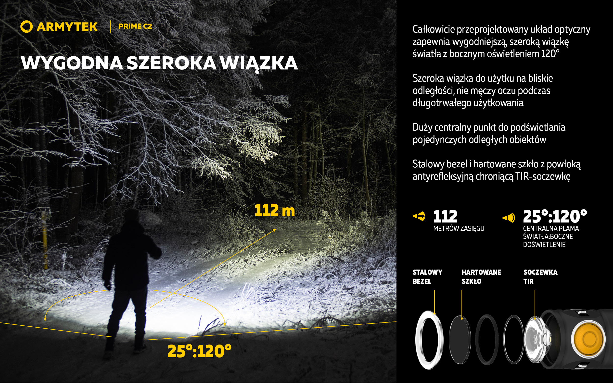 - Wygodna, szeroka wiązka z dużym punktem centralnym, całkowicie przeprojektowany układ optyczny, TIR soczewka chroniona przed zarysowaniami hartowanym szkłem z powłoką antyrefleksyjną.