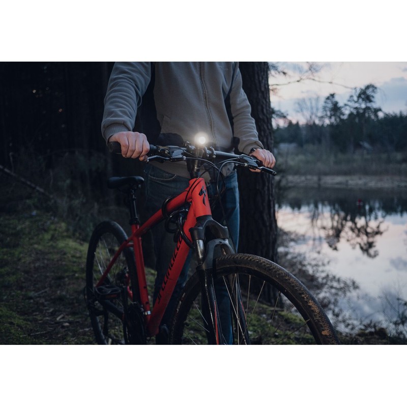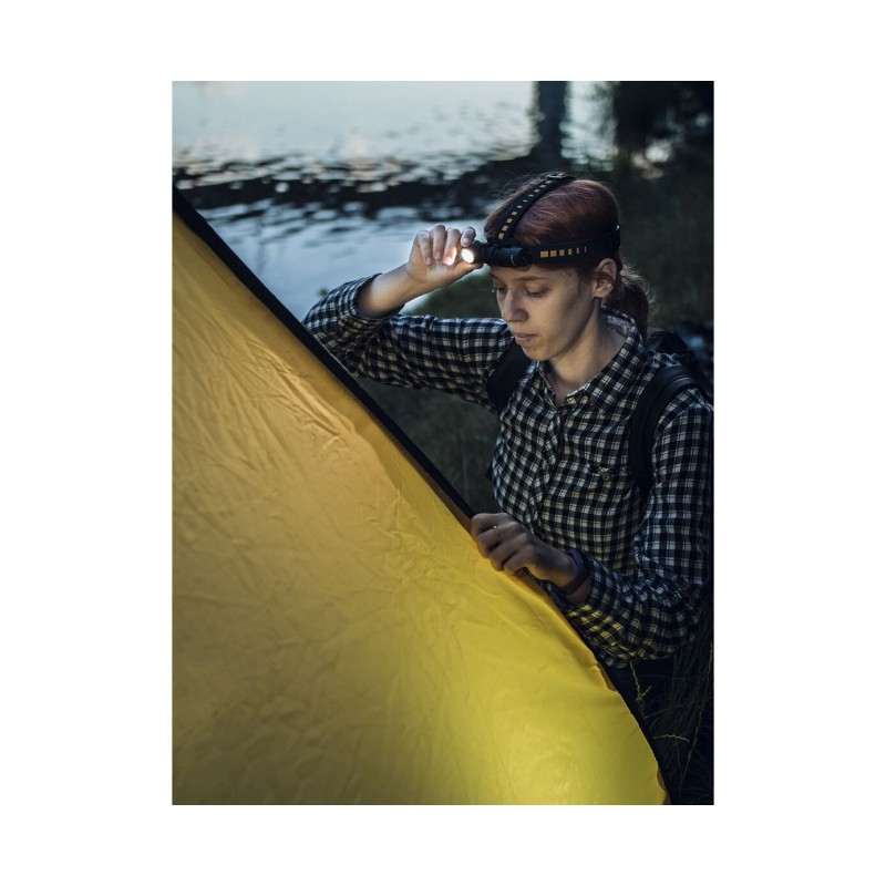 Wygodne mocowanie na czoło z dwoma miękkimi opaskami elastycznymi, lekkim plastikowym uchwytem i silikonowym pierścieniem dla dodatkowego zabezpieczenia. Opaski pewnie mocują latarkę, nie powodują otarć skóry i nie pozostawiają śladów. Latarkę można założyć jednym ruchem, a opaska na głowę ma możliwość regulacji rozmiaru.