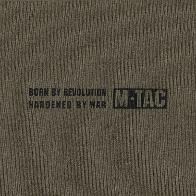Marka M-Tac stworzyła nową bluzę BORN BY REVOLUTION, która doskonale łączy w sobie wygodny krój z wysokiej jakości materiałami. Bluza została uszyta z miękkiego, przyjemnego w dotyku materiału (77% bawełna, 18% poliester, 5% elastan), który jest lekki, oddychający i komfortowy w codziennym użytkowaniu. Mankiety rękawów, dół bluzy oraz dekolt wykończone są elastycznym ściągaczem. Na wysokości klatki piersiowej umieszczono logo M-Tac oraz hasło przewodnie marki: Born by Revolution – Hardened by War, co w tłumaczeniu oznacza "Zrodzony rewolucją i zahartowany przez wojnę". Wygodny krój bluzy nie krępuje ruchów, a płaskie szwy zapobiegają otarciom i zapewniają maksymalny komfort podczas noszenia. Dopuszczalne jest delikatne suszenie wyrobu Materiał: 77% bawełna, 18% poliester, 5% elastan;
