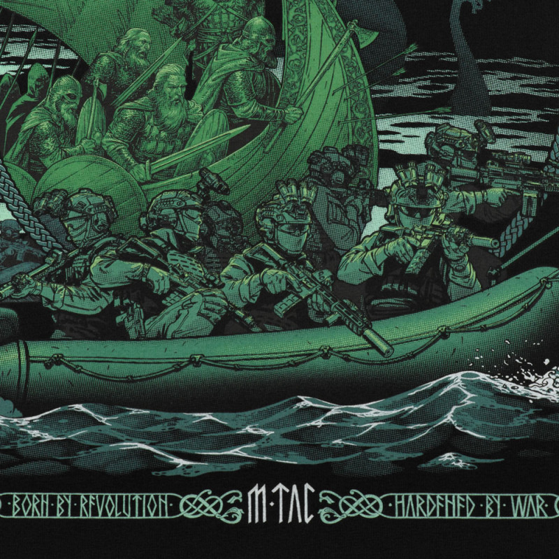 Od zarania dziejów szlak „Od Waregów do Greków” stanowił most między kulturami, łącząc kontynenty, zawiązując sojusze i będąc świadkiem niezliczonych heroicznych kampanii. Przez tysiąclecia nie stracił na znaczeniu – wciąż odgrywał istotną rolę w działaniach bojowych. I dziś przemierzają go współcześni wojownicy – potomkowie dawnych bohaterów – odważnie broniąc wolności swojej ojczyzny. Zainspirowani tą ideą, projektanci marki M-Tac stworzyli nowy T-shirt DRAKAR, który symbolizuje nieprzemijające zwycięstwo żołnierzy. Grafika na koszulce w symboliczny sposób ukazuje przeszłość i teraźniejszość, połączone burzliwym nurtem legendarnego szlaku. Starożytność reprezentują słynne smocze łodzie z nieustraszonymi zdobywcami na pokładzie, teraźniejszość – ich godni następcy, walczący na nowoczesnych łodziach pontonowych. Dzieli ich czas, lecz łączy wspólny duch i niezmienne dążenie, przekazywane przez pokolenia. Ponieważ bycie wojownikiem oznacza życie wieczne: w niezmiennym celu i działaniu. Koszulka DRAKAR została wykonana z wysokiej jakości dzianiny (bawełna z dodatkiem elastanu), która łączy nowoczesną technologię produkcji z wygodnym krojem, niekrępującym ruchów. Miękka i elastyczna tkanina zapewnia komfort noszenia nawet podczas aktywności fizycznej. Materiał: bawełna, elastan; Nadruk: MagnaColours® (atramenty Premium odporne na blaknięcie).