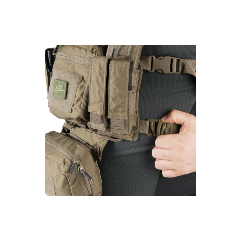 Training Mini Rig to uniwersalny system nośny zaprojektowany z myślą o instruktorach strzelectwa, pasjonatach broni oraz osobach regularnie trenujących na strzelnicy. Wykonany z wytrzymałej Cordury, zestaw wyposażono w regulowane oraz odpinane szelki w układzie H, a także regulowany pas biodrowy, co pozwala na wygodne dopasowanie do sylwetki użytkownika.